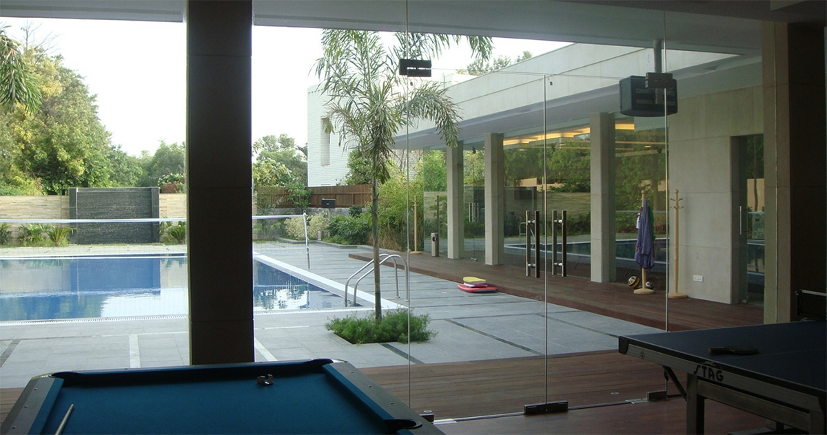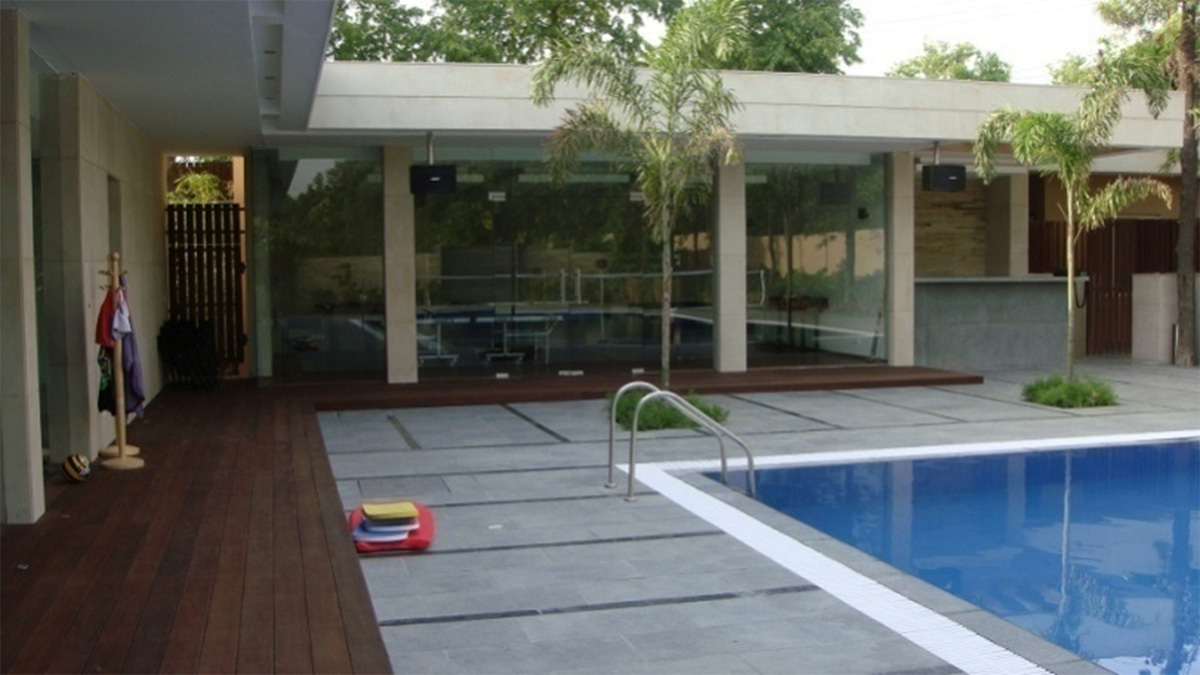 Extension of an existing farmhouse, this zone was designed as a party zone along with spaces for a lounge, pool table, spa and swimming pool- all equipped with state of the art amenities like a house theatre system along with water proof speakers in swimming pool to name a few. The approach to design was very simple and direct. Subtle combination of direct and indirect lights, richly carved stone cladding in the lounge, large toilets with an open to sky dedicated rear garden and a pool side bar surely made this place very celebrative.