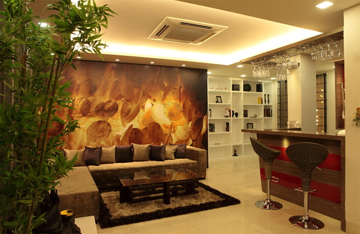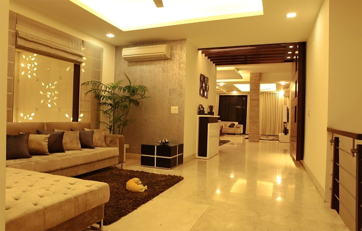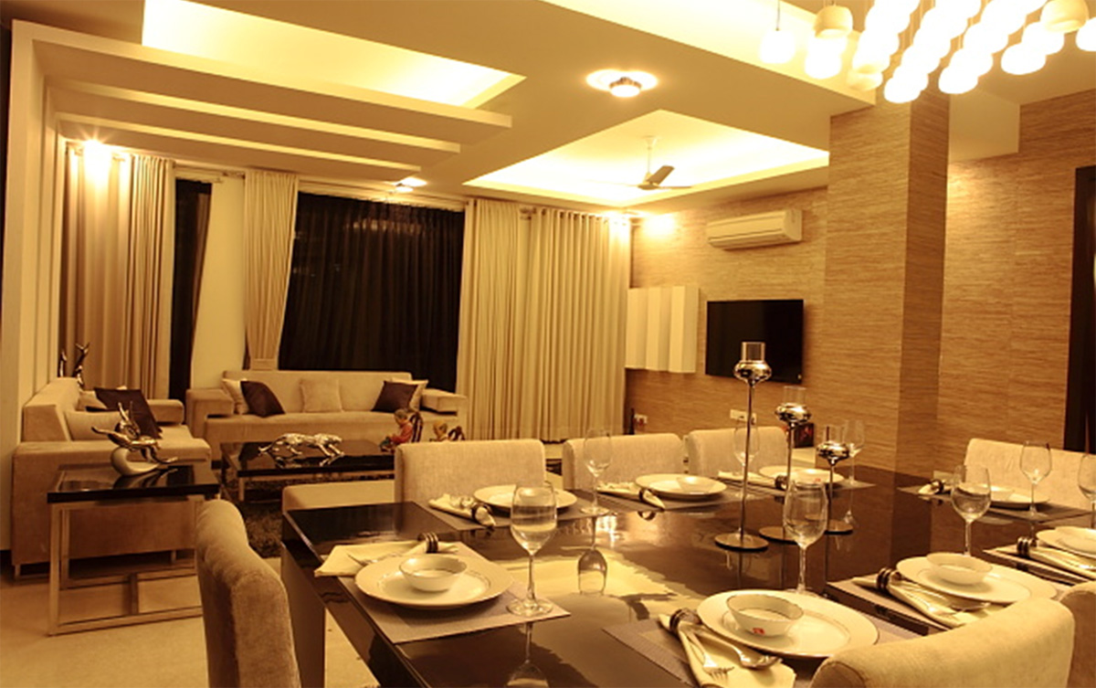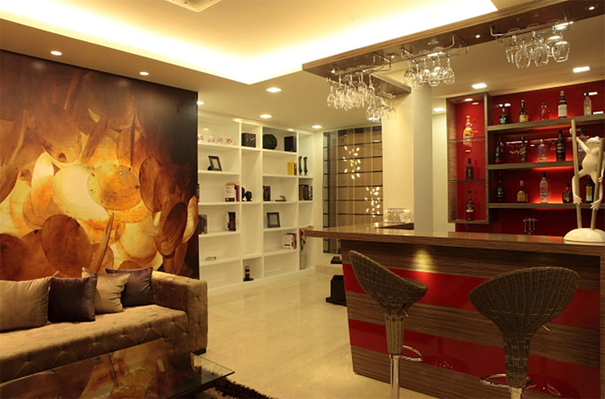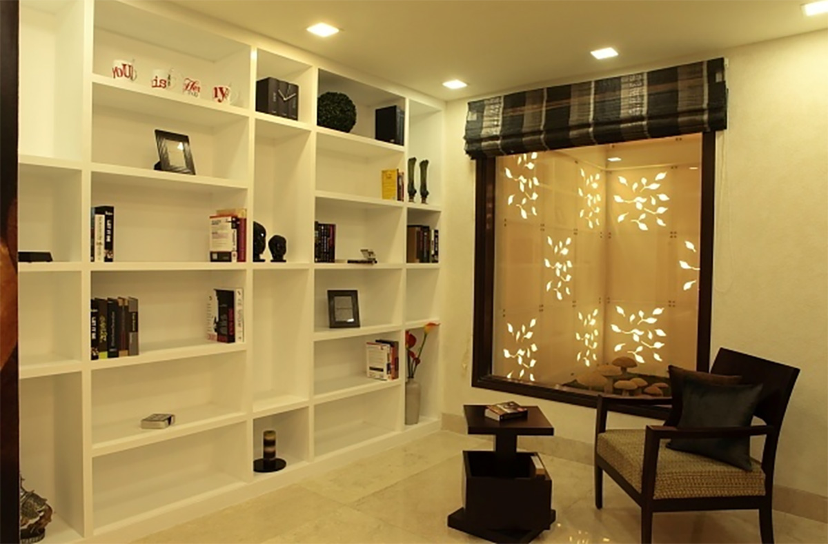 A different project in styling and approach, this project happened directly on site, without any drawings or reference. The highlight of the project is the shaft, which otherwise ignored becomes the piece of celebration furnished with Corian CNC cut screens, being made a part of the living and bedroom areas. Extreme detail has been given to the accessorising, with each piece being handpicked, adding that characteristic élan to this residence.