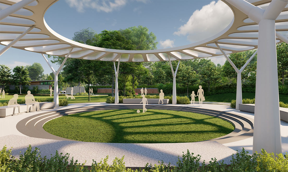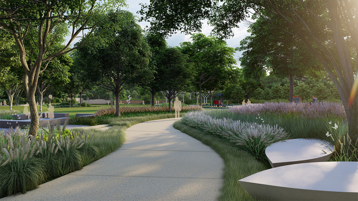 A clear jogging loop encircles the central open ground, weaving through multiple pause points and amenities. The vista opens up with engaging landscape features: art walls, circular huddle zones, a ring pavilion, sports corners, fitness corners, and interactive pockets. A series of floral sweeps enhances the experience, with species that bloom across the year. Bespoke elements and intricate attention to detail make the park unique and experiential.