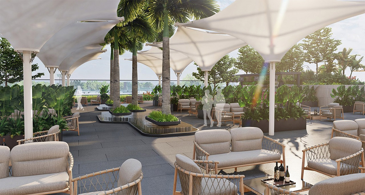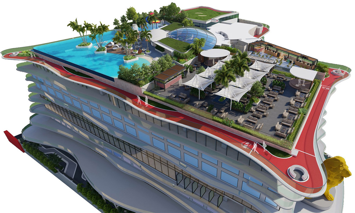 The concept was originally inspired by cruise liners, reflected in the fluidity of its architectural lines. Beyond its rich and immersive arrival plaza at the ground level, the property is wrapped by landscaped terraces, sky jogging tracks, and outdoor decks. The rooftop features multiple recreational pools including a beach pool and kids’ pool, along with lounge decks that allow visitors to enjoy sweeping views of flights and horizons across infinity-edge waterscapes.