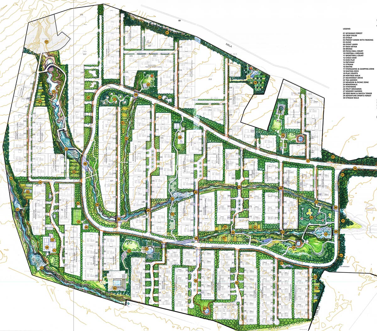The design philosophy of Kashi-Ra embraces pioneering Blue-Green Landscape engineering, which aims to sustain local watersheds, seasonal streams, and tranquil water bodies such as kunds and miniature lakes strategically positioned throughout the estate. These elements not only enhance the ecological balance but also create serene spaces for residents to connect with nature.