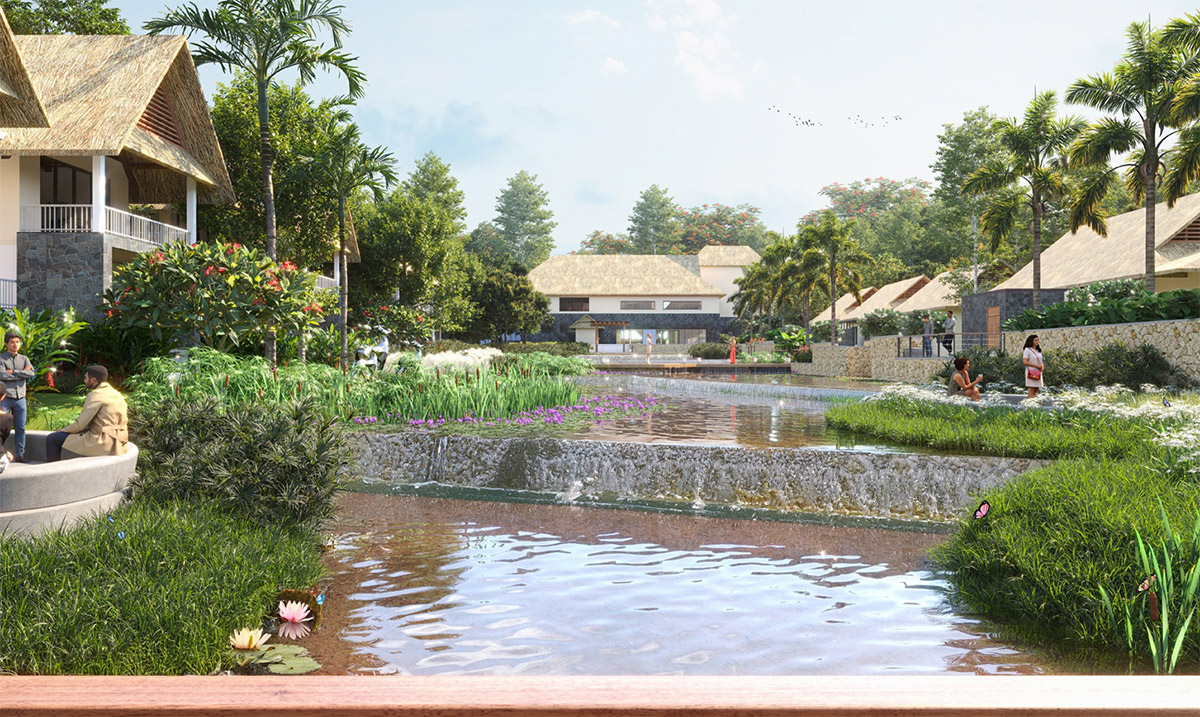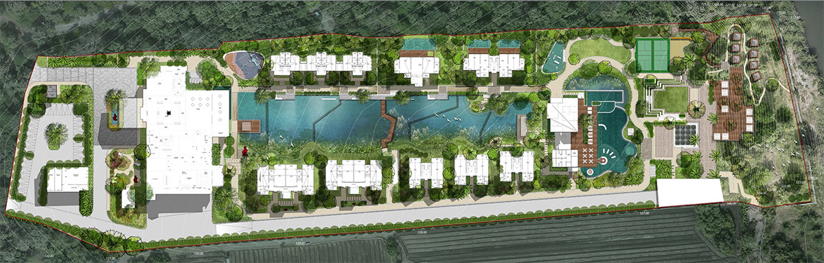 The recreational zones and landscape amenities extend across the length of this linear property, which already benefits from existing clusters of mature trees. Outdoor cabanas, decks, and camping zones cascade down the natural slope toward an active stream, creating a dynamic and immersive outdoor lifestyle.