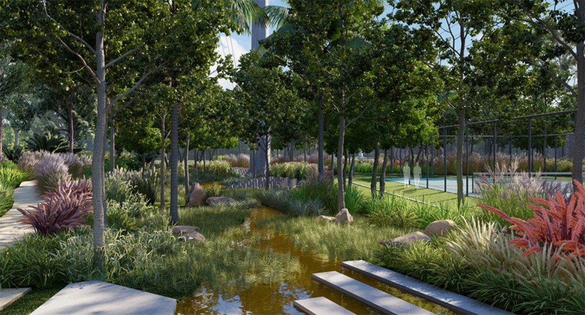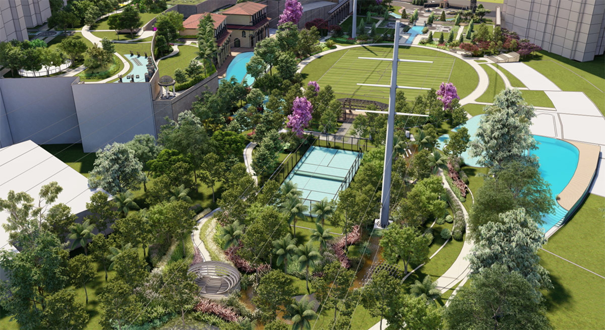 The design introduces a green continuum across staggered podiums, culminating in the largest podium, which serves as the main amenity space for residents. This central space, located under a high-tension line, restricted built structures, leading to the creation of a large central oval ground—a versatile play zone. Beyond this, tennis courts and other amenities are provided.